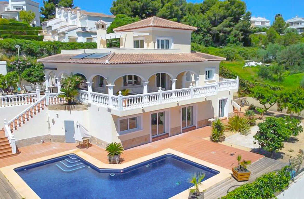 Deze traditionele Spaanse villa bevindt zich op nog geen 3 kilometer van het centrum en het hoofdstrand van Moraira en is te voet te bereiken vanwege de nagenoeg vlakke wegen er naartoe. De villa is verdeeld over 3 verdiepingen. Op het algemene leefgedeelte bevinden zich een ruime salon met eethoek, een volledig ingerichte moderne keuken, 2 tweepersoons slaapkamers en een badkamer. Zowel de woonkamer als de keuken bieden toegang tot het ruime overdekte terras. Daarnaast is er een barbeque gedeelte aan de andere zijde van de woning. Op de bovenste verdieping bevindt zich de hoofdslaapkamer met badkamer en suite welke tevens toegang heeft tot een groot prive balkon. Op de beneden verdieping bevindt zich een tweede salon met een tweepersoons slaapkamer met badkamer en suite waardoor het uitermate geschikt is als gastenverblijf. Het terras met zwembad bevindt zich tevens op de verdieping waardoor het over veel privacy beschikt.