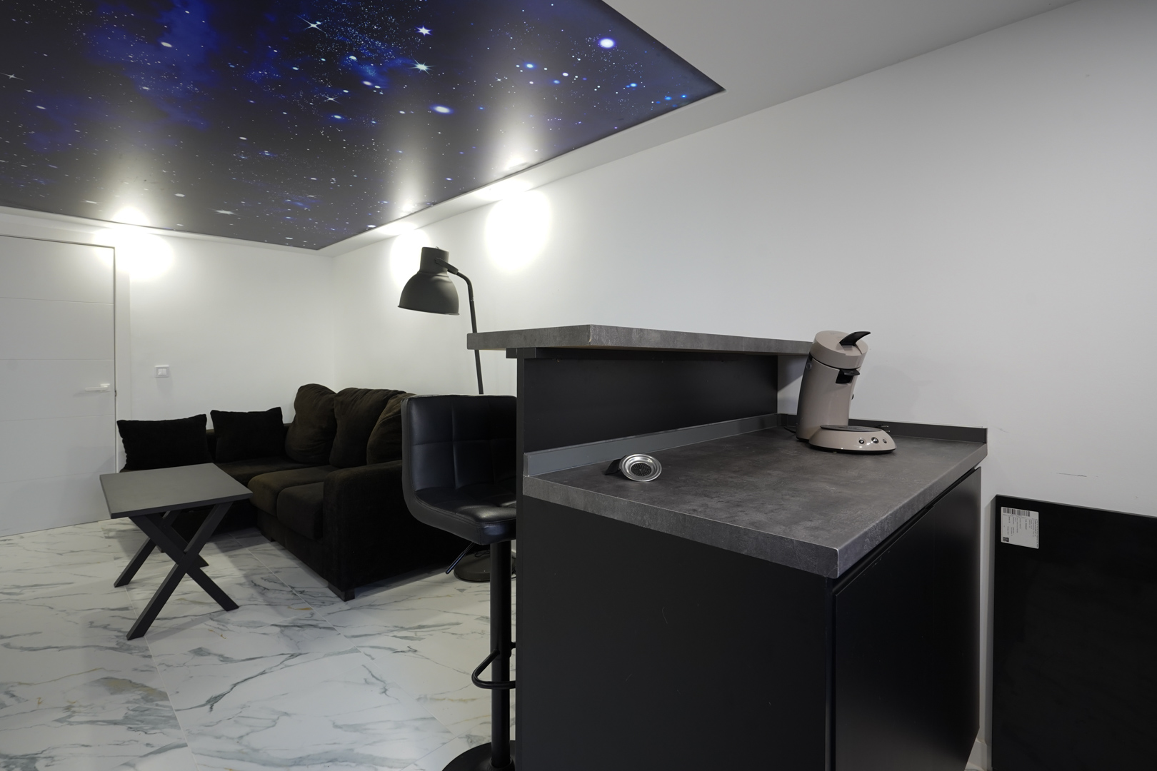 De benedenverdieping vormt een volledig onafhankelijk gastenverblijf met een woonkamer, open keuken, drie slaapkamers en een badkamer. Perfect voor familie, vrienden of als verhuurmogelijkheid. Het gastenverblijf is zowel intern verbonden met de woning als toegankelijk via een privé-ingang. Twee van de drie slaapkamers geven directe toegang tot het terras bij het zwembad.